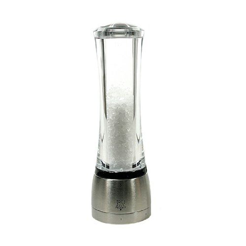 PEUGEOT: France, since 1810. Peugeot mills are renowned by chefs and gourmet cooks the word over for the consistent grind results they produce, their incredible resilience and proven reliability. Compromise is not a word that fits into the Peugeot vocabulary. For each spice, there is one – and only one – Peugeot grinding mechanism: peppercorns; coarse dry salt; chilies; herbs and spices; wet salts; and nutmeg. Add the coffee mechanism, which started it all, and there are seven unique Peugeot mechanisms. Each is designed to derive the most flavor and greatest aroma from its complementary spice. Aesthetically pleasing, Peugeot mills deliver the height of quality, durability, reliability and innovation; making these mills the ones to which all others are compared. Daman: a classic pairing of crystal clear acrylic and stainless steel combine to reveal Peugeot’s latest innovation: its shaftless design takes grinding excellence to a new level of convenience! With the removal of the center shaft, the top knob has now been replaced with a magnetized stopper. This provides the double benefit of greater spice capacity and easier refilling. Daman features Peugeot's exclusive u'Select grind adjustment system, which allows the grind to be adjusted with a simple turn of your wrist! Turn the ring at the bottom of the mill in one direction to make the grind finer; turn in the other direction to make it coarser. Once the grind size is set, it will stay in place until the user changes it. This mill is equipped with Peugeot’s exceptional salt grinding mechanism: it is unlike anything else on the market. Its two ribbed plates are made from a stainless steel blend that offers resiliency, rigidity and resistance to corrosion from dry salts. When the mechanism is activated, the ribs work to twist and fracture each salt crystal to the desired size. Mill is 6-1/2-inches tall. ...Read more