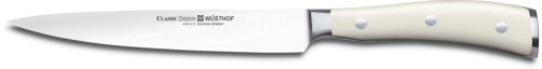 Sandwich knives are a utility that does it all. Small enough to peel yet large enough to slice a great choice when the paring knife just isn't long enough. Wusthof Classic Ikon Creme is a culmination of all the best features of each of the Wusthof knife lines. The combined riveted handle design is combined with a contoured shape to add comfort and control. The Classic Ikon adds a rear bolster that acts as a counter balance when using the knife. This second bolster adds significant blade control. Classic Ikon has a unique forward bolster as well. The forward partial bolster is designed so you can sharpen the complete length of the blade. This bolster is also curvered inwards to allow your fingers greater control while holding the knife by the blade. Located in The Cutlery Capital of the World, Solingen Germany, the Wusthof factory history goes back as far as 1814 when the company was listed with the Duchy of Berg. To this day, the company remains family owned. Throughout it’s history, Wusthof has focused almost solely on the manufacturing of forged knives for the professional chef and home cooking enthusiast. Wusthof uses a special blend of German steel through out the whole length of the knife. The ingredients of this steel are proudly etched on each blade. Wusthof not only uses the best materials to make a fine knife, but it is also crucial that each blade is precisely tempered. This tempering allows the knife to hold its edge for an extremely long time, yet still be able to be maintained in your home kitchen with out the need to be sent away for maintenance. Our unique compound angle is not seen in many knives. This angle tapers from the spine of the knife to the edge to allow for a sturdy, yet extremely sharp edge while it also tapers from the bolster to the tip to give the knife strength as well as flexibility. ...Read more